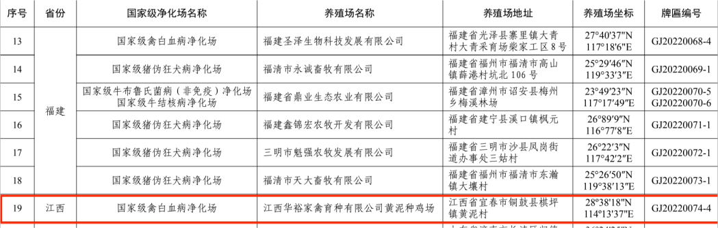 2022年11月7日,農(nóng)業(yè)農(nóng)村部辦公廳公布了第二批國(guó)家級(jí)動(dòng)物疫病凈化場(chǎng)名單,江西華裕黃泥種雞場(chǎng)獲得“國(guó)家級(jí)禽白血病凈化場(chǎng)”稱號(hào)。