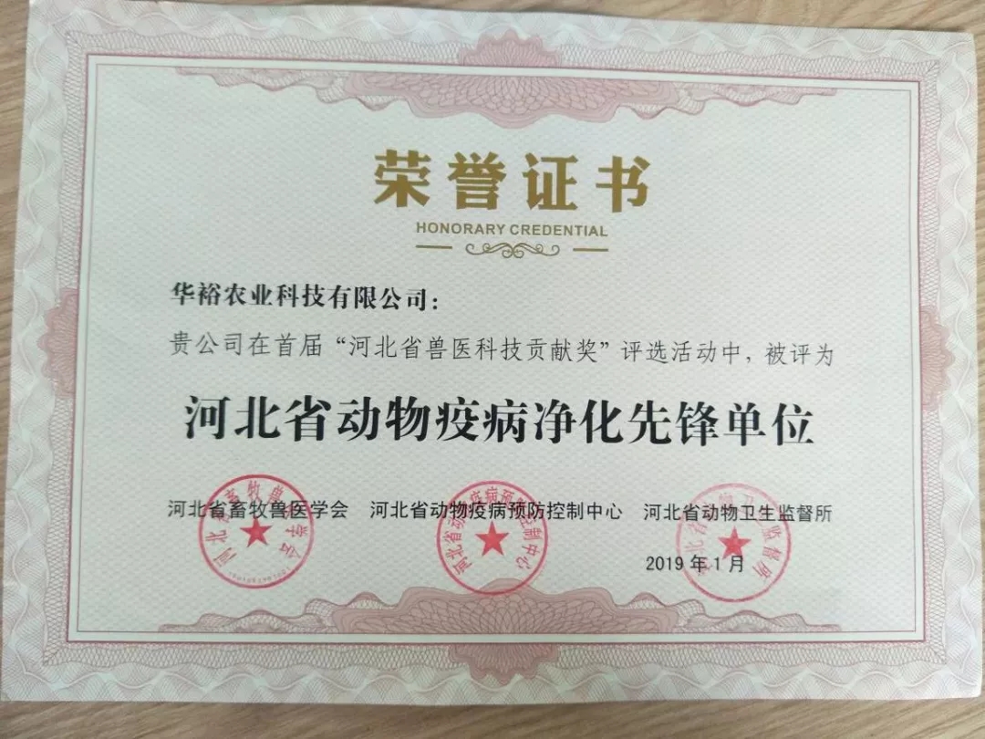 2018年,在河北省組織的首屆“河北省獸醫(yī)科技貢獻(xiàn)獎(jiǎng)”評(píng)選中,華裕農(nóng)業(yè)科技有限公司被評(píng)為“河北省動(dòng)物疫病凈化先鋒單位”。