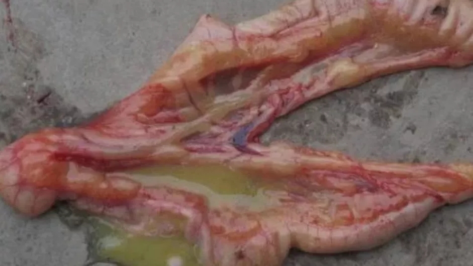 剖檢可見腸道擴(kuò)張,腸內(nèi)充滿液體、氣體,腸壁變薄,腸粘膜脫落,肝臟顏色變淺,有時表面有壞死灶,腎臟腫大、萎縮,顏色蒼白或有白色尿酸鹽沉積。